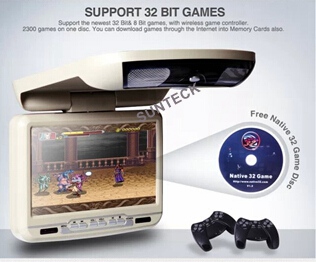 32 bits wireless games for 9 inch car roof mount monitor players car headrest monitor is a perfect backseat entertainment system with a built-in 32 bits game engine and wireless joystick. Family members can enjoy their journey in the back seats. We offer a game disc and thousands of free games can be downloaded from: www.native32.com/english